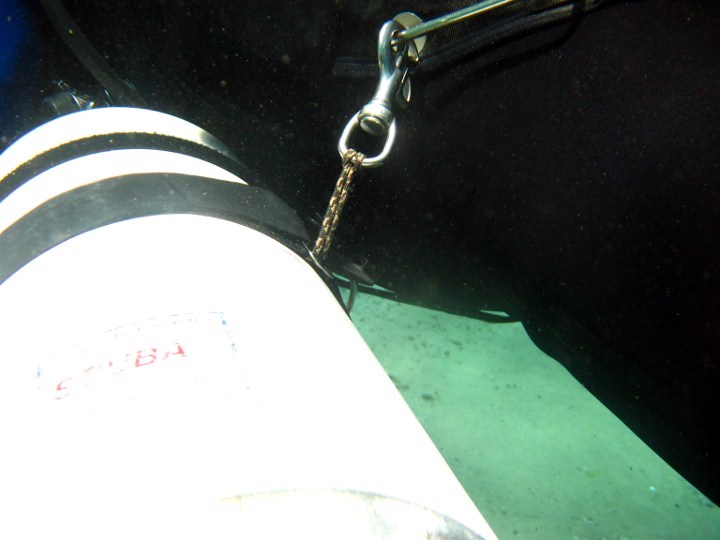 In the first photo is a Faber LP95 at the beginning of the dive. The weight of the gas in the cylinder is heavy enough to keep the cylinder pushed down at the rear attachment point.