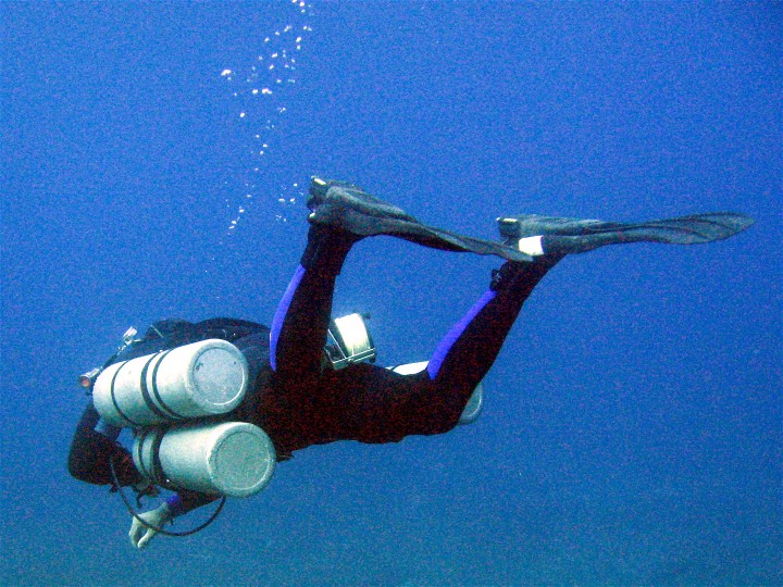 The next option was to route the top clip and bungee under the arm. This worked well. It didn’t require as much flexibility and kept the top of the cylinder cinched down close to the diver’s body. The issue with this method was in keeping the bottom of the cylinder from floating up as the gas in that stage cylinder was breathed down.